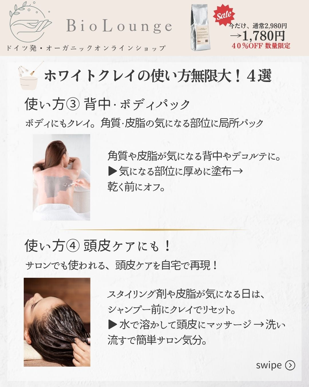 適量のお水にクレイを溶かし、フェイスマスク、全身用マスクとしてご使用ください。 お水の代わりオリーブオイル、ハニー、ラベンダーエッセンスを加えてご使用いただくことより、リラックス効果も◎。 2〜3mmの厚さを肌に伸ばし、15〜20分後乾いたらぬるま湯で洗い流してください。