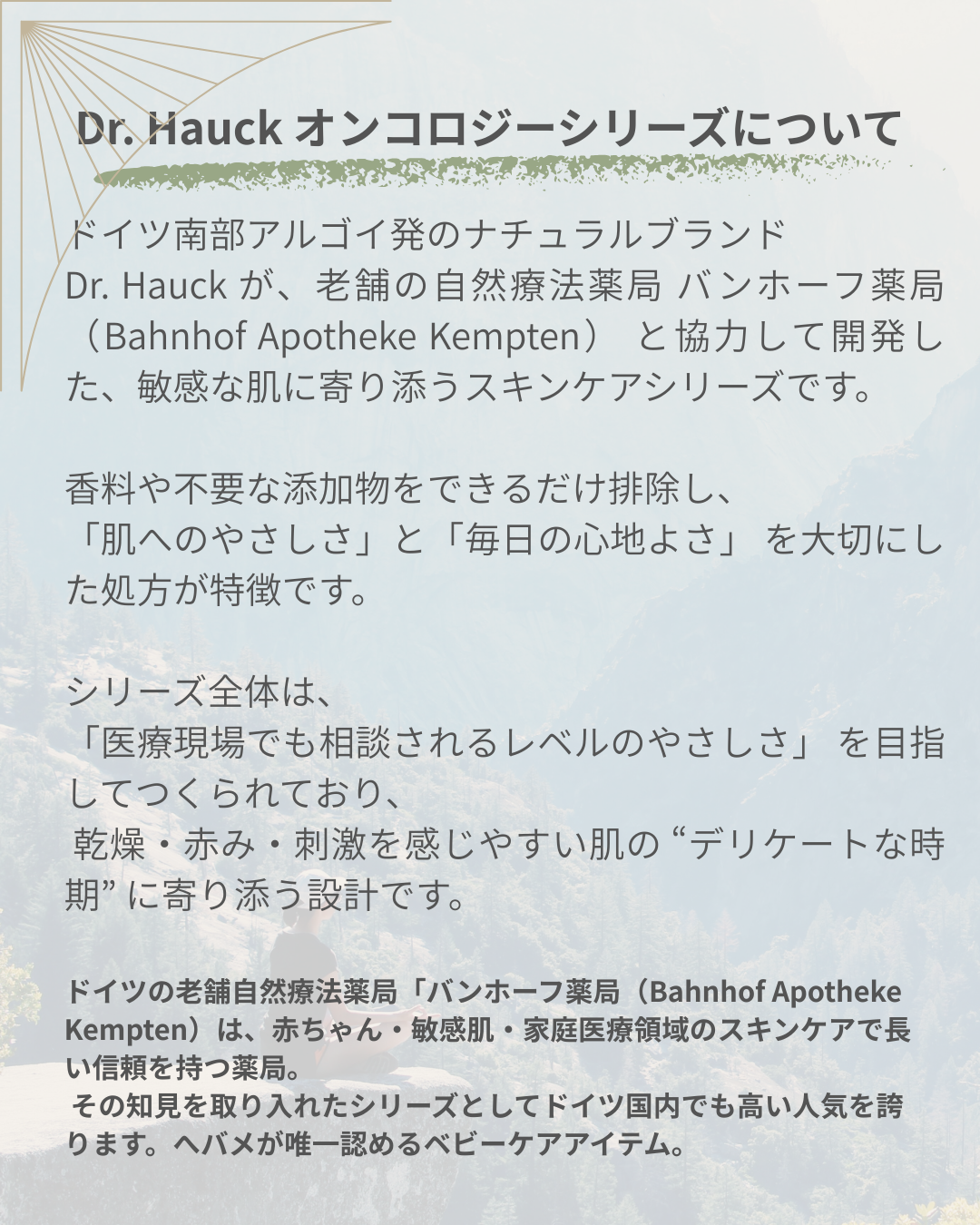 Bahnhof-Apotheke Kempten(ドイツの有名ナチュラル薬局)」との共同プロジェクトとして、 「オンコロジー向けナチュラルコスメシリーズ」を立ち上げています。清潔な肌に適量を手に取り、やさしくなじませてください。